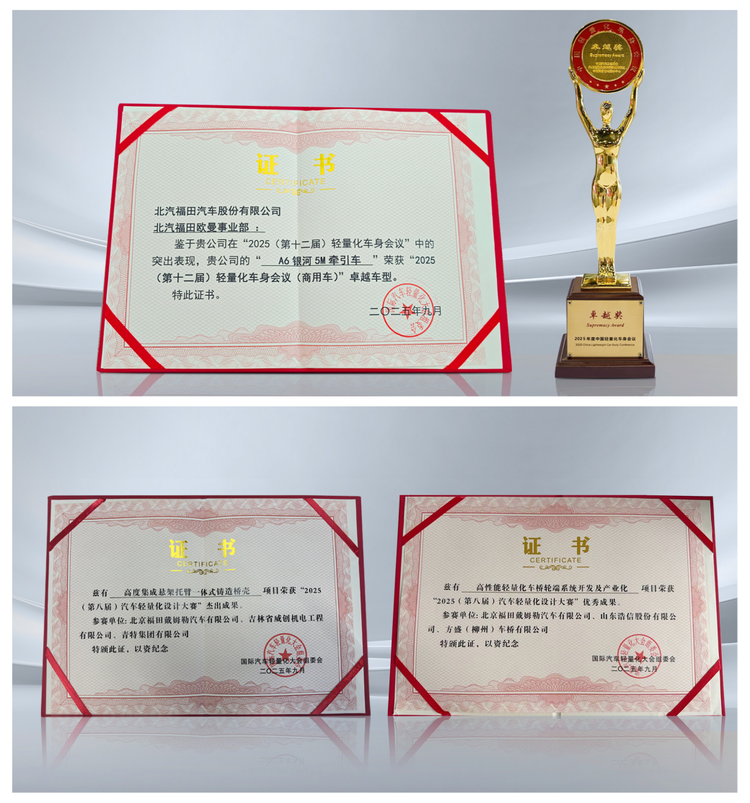 近日,欧曼银河5M 6×4牵引车在 “2025(第十二届)轻量化车身会议(商用车)” 中斩获最高奖项—— 卓越车型奖。与此同时,其 “高度集成悬架托臂一体式铸造桥壳项目” 与 “高性能轻量化车桥轮端系统开发及产业化项目”,在“2025(第八届)汽车轻量化设计大赛”中分别荣获杰出成果与优秀成果奖。这一系列荣誉不仅是行业对欧曼研发能力的高度认可,更标志着其轻量化技术已迈入系统化、平台化的成熟阶段,为商用车高效运输注入新动能。
