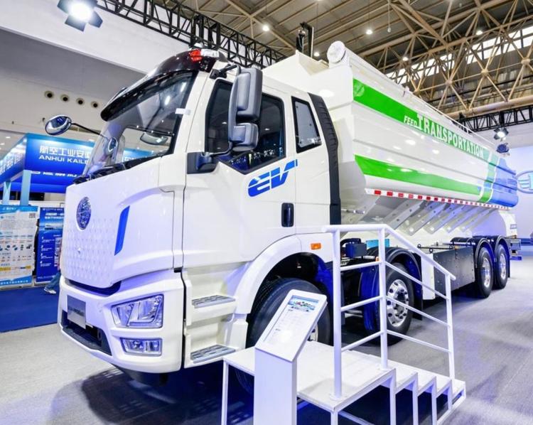J6L 8×4 纯电饲料运输车:采用一体化结构与智能控制系统,具备高强度、轻量化与快速充电能力,保障饲料运输全程安全、高效。