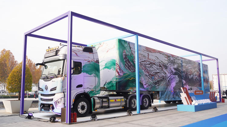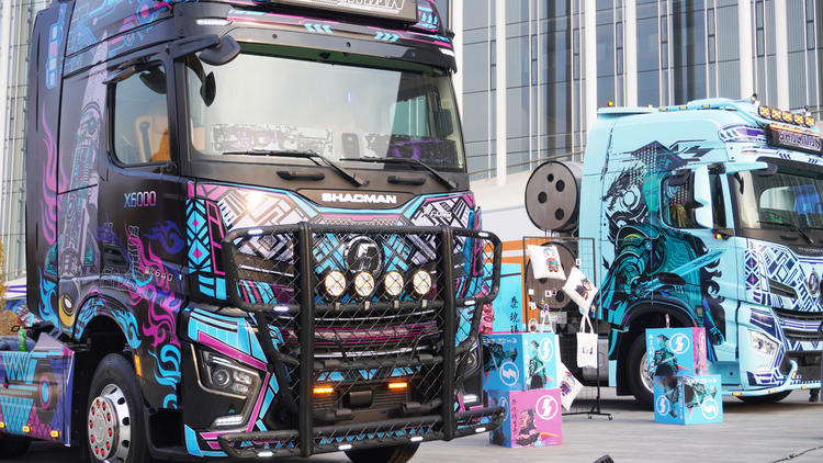 迎宾通道上,摆放着有些“格格不入”的重卡,他们色彩艳丽、个性鲜明、光鲜夺目,九三阅兵、哪吒等身上的涂装述说着中国的故事,让重卡在工具属性之外,更是文化的传播平台。