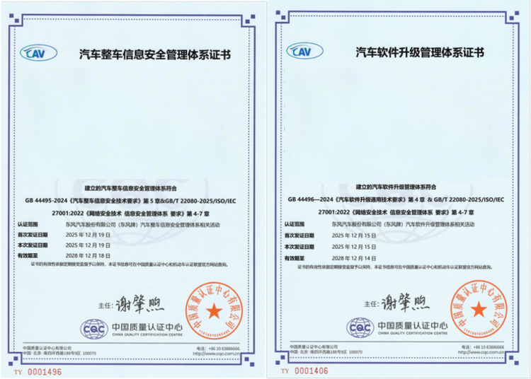 近日,东风汽车股份有限公司成功取得GB 44495《汽车整车信息安全技术要求》与GB 44496《汽车软件升级通用技术要求》两项智能网联汽车强制性国家标准的CAV体系认证证书。这标志着公司在整车信息安全领域的合规体系建设已处于行业前列,为产品满足将于2026年7月1日实施的国内最新法规要求奠定了坚实基础。