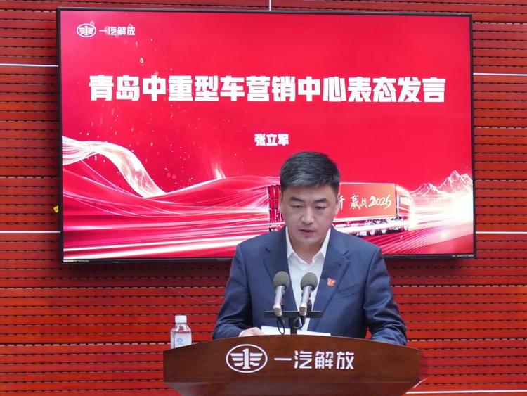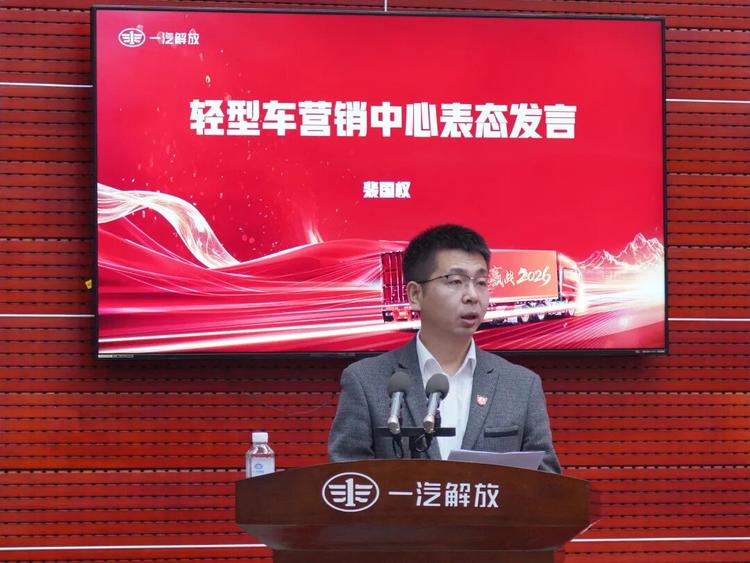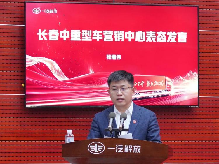 营销总部负责人作营销工作报告。长春中重型车、青岛中重型车、轻型车三家营销中心负责人作表态发言。