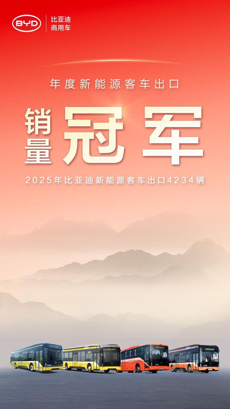 比亚迪商用车2025年新能源客车出口4234辆 连续三年蝉联销量冠军