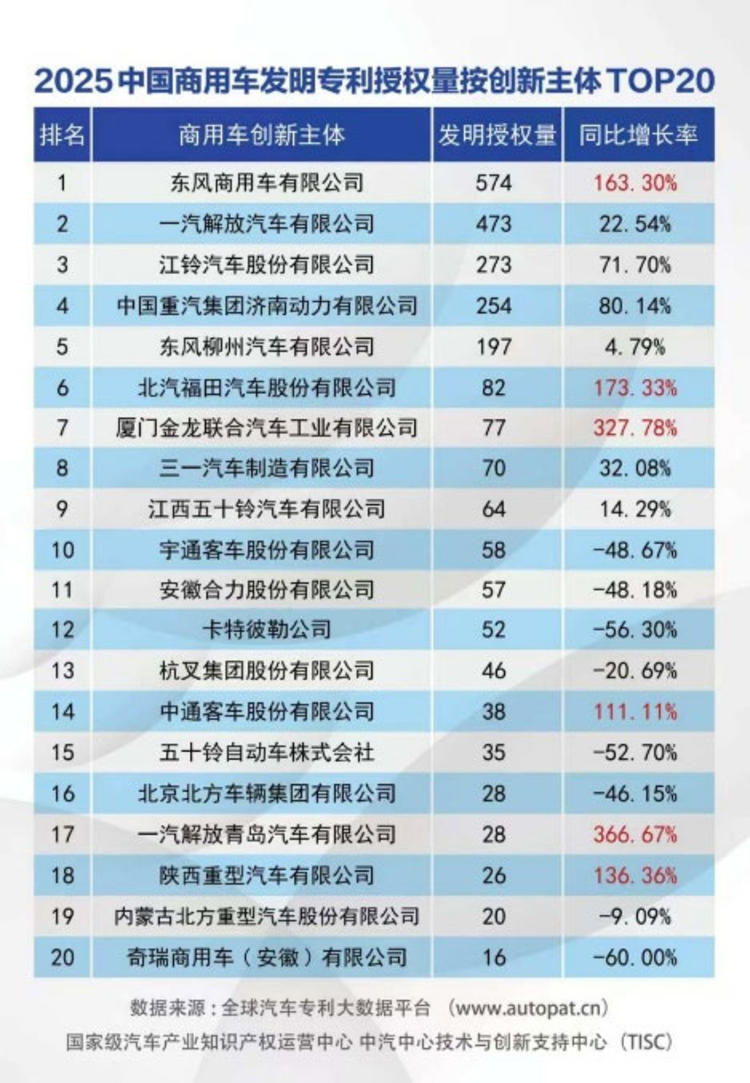 近日,中汽中心技术与创新支持中心正式发布《2025年中国汽车专利数据统计研究报告》。报告显示,东风商用车有限公司2025年全年发明专利授权量达到574件,同比增长163.3%,位居国内商用车行业第一,再次彰显其在技术创新领域的领先实力。