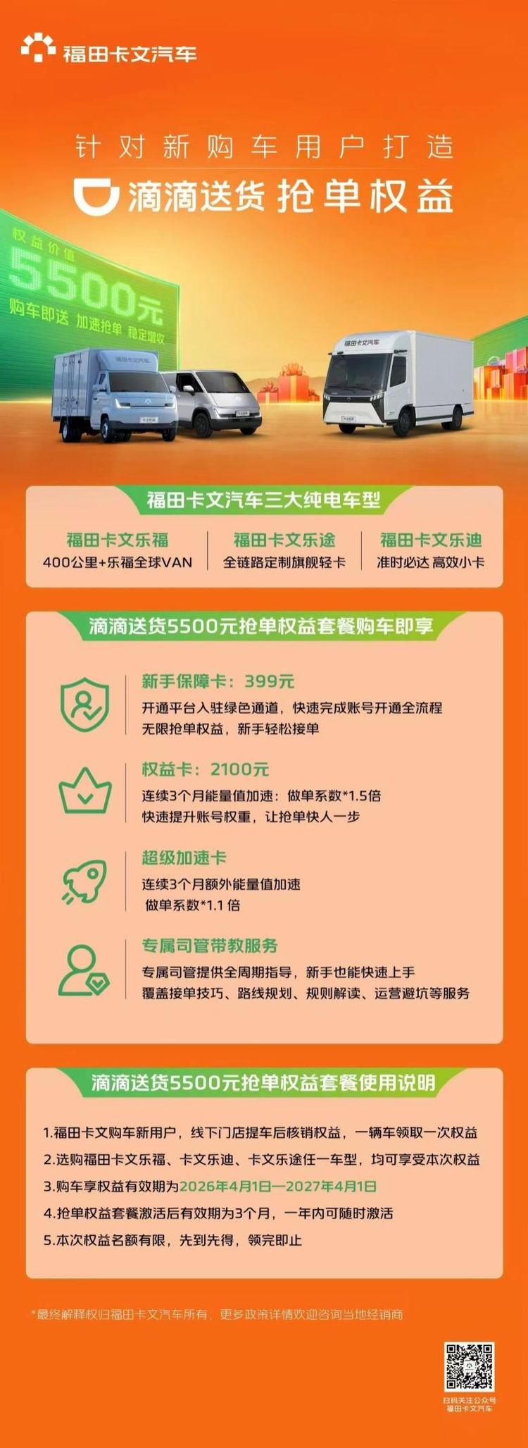 福田卡文联合滴滴送货,为购车新用户送上价值5500元抢单权益套餐,全方位助力车主高效增收、稳定运营。