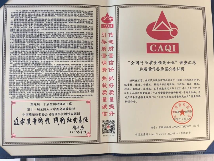2025-09-28东风汽车股份有限公司被评为全国质量领先企业