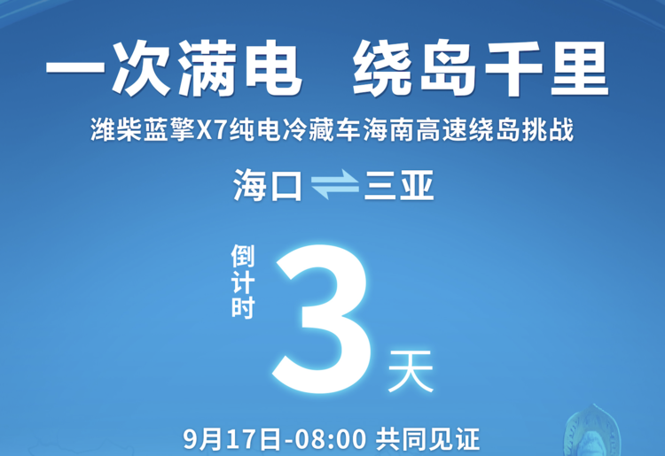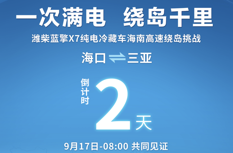 2025-09-15一次满电,绕岛千里!距离潍柴蓝擎X7纯电冷藏车海南高速绕岛挑战还有2天