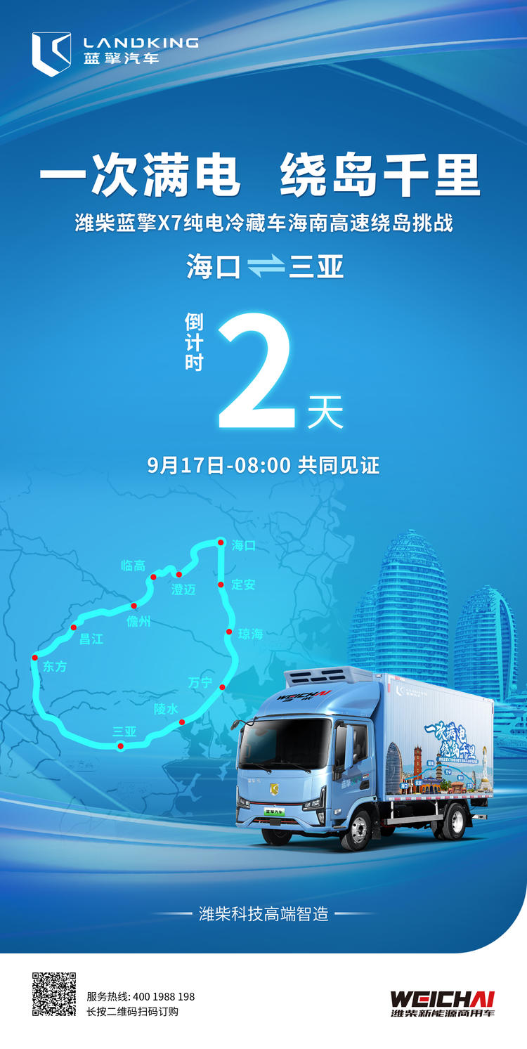 一次满电,绕岛千里!距离潍柴蓝擎X7纯电冷藏车海南高速绕岛挑战还有1天