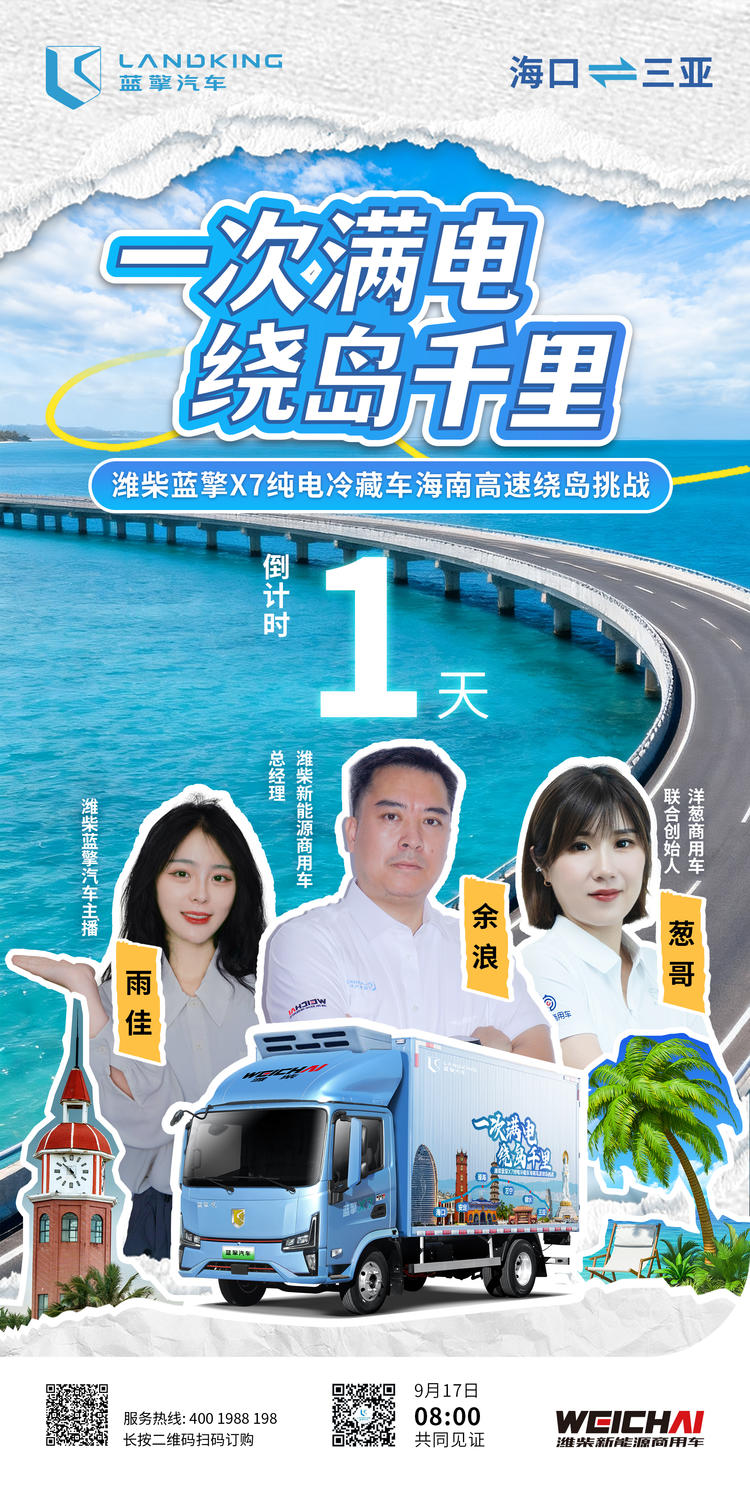 一次满电,绕岛千里!距离潍柴蓝擎X7纯电冷藏车海南高速绕岛挑战还有2天