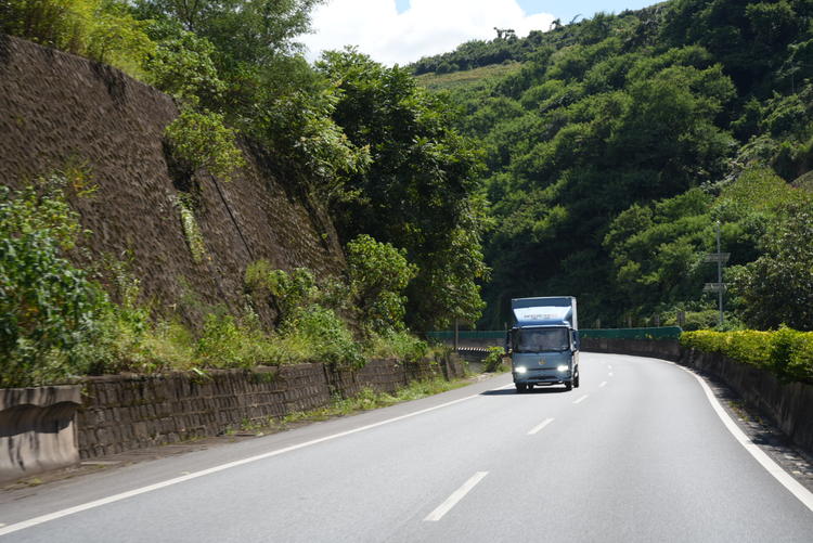 上坡在整段路程中占比非常大,尤其是还有一段27公里长上坡,行程中平均坡度6%。潍柴蓝擎X7西南山区版使用的是博世200kW、峰值扭矩500N·m电机,丰沛的动力带来攀爬的底气。同时,它还搭载了行业中速比最大的汉德双档电驱桥,低挡速比25.03,整桥能额定输出扭矩10000N·m,提升72.4%,爬坡能力提升89%,爬坡稳健有力。