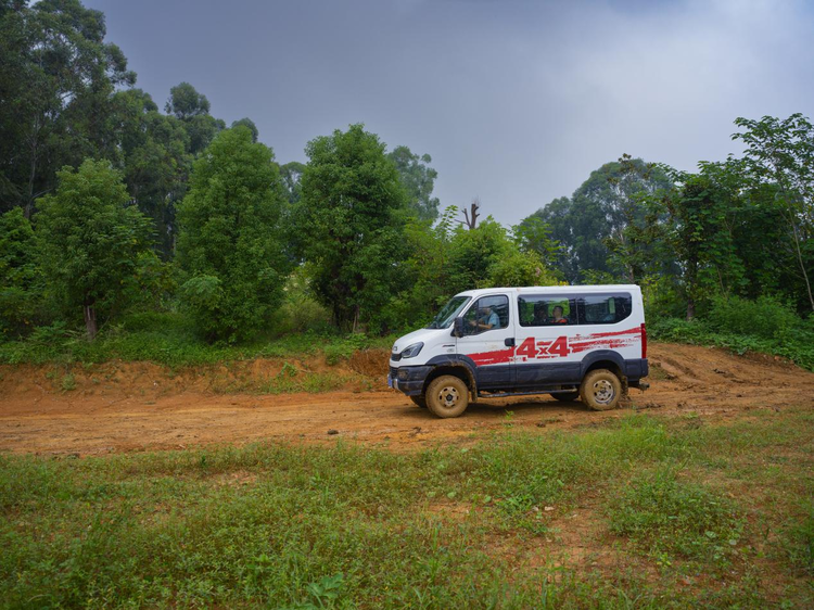 鸡窝坑不大,但难就难在这“不大”二字。因为腾挪空间小,所以一旦陷入其中,就很难脱困出来,对车辆的动力、悬挂、轮胎、车身结构和电子辅助系统等方面,都有着极高要求。说实话,刚开始的时候,我是真没想到能一把就拉起来,依维柯欧霸·山海的越野性能真是太给力了。全地形轮胎提供了稳定抓地力,专业级悬架避免底盘剐蹭、托底,高强度非承载式车身让车辆坚如磐石,一脚油门踩下去,发动机瞬间爆发出430N·m的巅峰扭矩,全时四驱将动能精准分配到每个车轮,只见欧霸·山海一个旱地拔冲,从深坑中一跃而上,雄起!