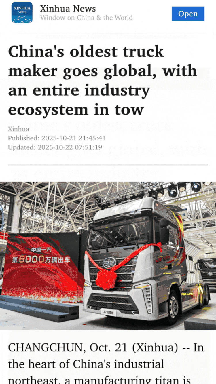 CHANGCHUN, Oct. 21 (Xinhua) -- In the industrial heartland of China––the Northeast, a manufacturing titan is undergoing a quiet transformation. FAW TRUCKS, the commercial truck behemoth that represents the very roots of the country's automotive industry, is steering its massive operations toward uncharted territories, far beyond the familiar domestic markets that it has long dominated.