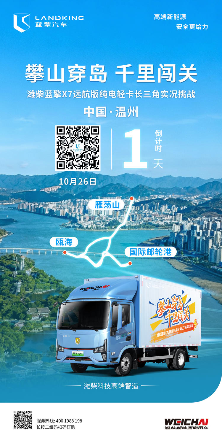 攀山穿岛,千里闯关!距潍柴蓝擎X7远航版纯电轻卡长三角实况挑战还有1天
