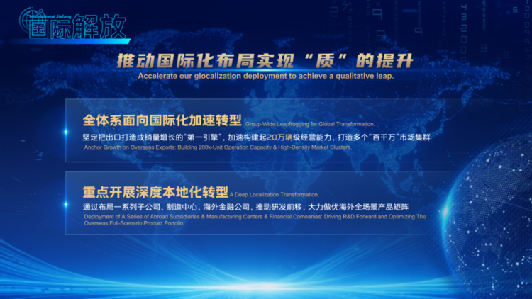 一汽解放将全体系面向国际化加速转型,坚定把海外出口打造销量增长的“第一引擎”,加速构建起20万辆级经营能力。市场布局上,将“多点开花”,分梯次打造多个“百千万”市场集群;同时,重点开展深度本地化转型,通过布局一系列子公司、制造中心、海外金融公司,支撑海外销量提升;推动研发前移,精准适配海外市场需求,打造“生而全球”的产品,大力做优海外全场景产品矩阵。推动解放国际化迈出更快步伐、迈上更高台阶。