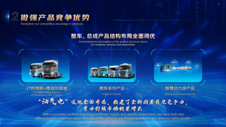 整车、总成产品结构布局全面调优,J7创领版高端重卡、鹰阵系列产品、智慧动力域产品相继上市,“油气电”实现全面布局,构建了全新的差异化竞争力,有力引领市场销量增长。