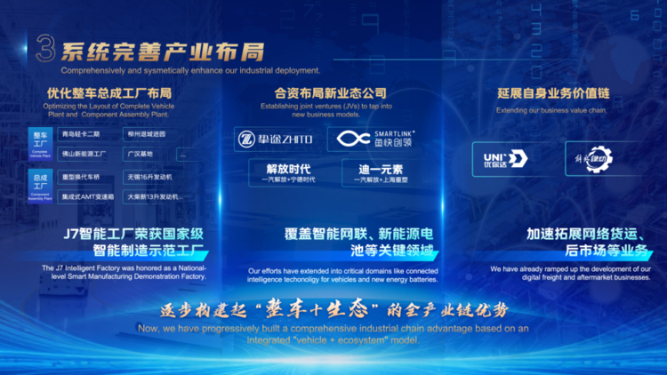 相继落地多个整车、总成工厂项目,J7智能工厂荣获国家级智能制造示范工厂。先后合资成立挚途科技、鱼快创领、解放时代等新兴产业科技公司,覆盖智能网联、新能源电池等关键领域。成立优你达、解放绿动等企业,加速拓展网络货运、后市场等业务。逐步构建起“整车+生态”的全产业链优势。