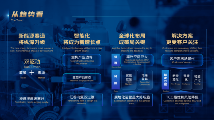 从趋势来看:一是新能源赛道将纵深升级,由“政策”驱动转向“政策+市场”双轮驱动,渗透率高速攀升,新技术、新模式将重构产业格局。二是智能化将成为新增长点,智能驾驶步入“低谷向复苏过渡”阶段,智能化将重构产品形态和物流运输产业边界。三是全球化布局成破局关键,海外需求空间广阔,但贸易壁垒与地缘差异,倒逼企业转变出海模式,属地化运营是大势所趋。四是解决方案更受客户关注,物流行业竞争加剧,客户需求更加场景化,新能源化、智能化以及轻资产化等不同解决方案,带来不同场景下的TCO最优和风险降低,成为客户决策的重点。