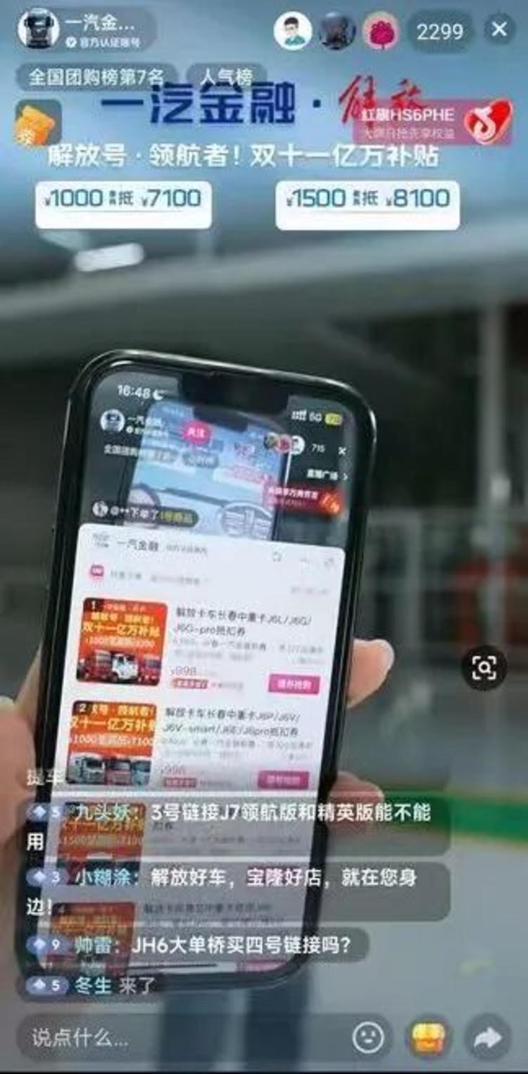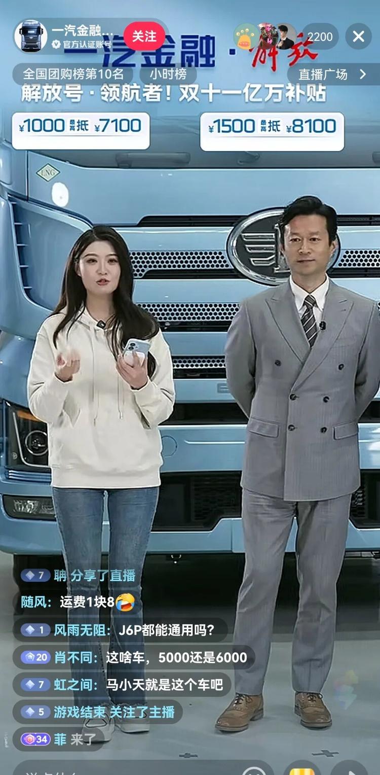 11月11日,一汽解放与一汽租赁强强联合,以抖音平台为载体,在一汽解放J7整车智能工厂成功举办“解放号·领航者!双十一亿万补贴”的全球商用车行业首家直播推介活动。一汽解放党委副书记、工会主席王浩出席活动并出镜直播带货,与广大卡友分享解放品牌发展历程与战略愿景。直播间气氛持续高涨,团购券销量超6000台,活动期间最高跻身“全国团购榜”第四名,累计场观人数高达27.6万,峰值在线人数突破1.8万人,平均在线人数1703人,新增粉丝2331人,不仅开创了商用车行业营销新模式,更实现了品牌影响力与市场销量的双丰收。