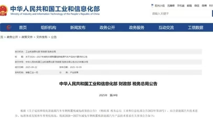 三部门联合发布的公告明确规定,2026年1月1日起,购置税减免政策将从“全额免征”调整为“减半征收”,同时对新能源汽车产品技术要求进一步提高。