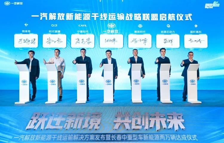在与会嘉宾见证下,一汽解放与解放时代、宁德时代、时代骐骥、启源芯动力、国轩高科、特来电6家企业共同签署战略合作协议。通过整合优质资源,提升新能源产品全生命周期运营价值。