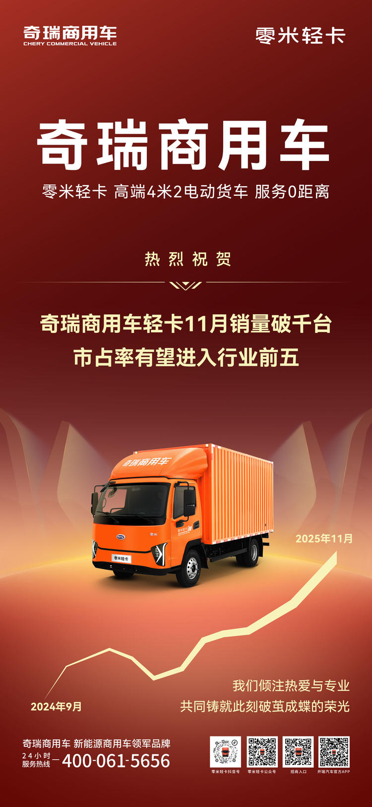2025年11月,奇瑞商用车零米轻卡迎来里程碑时刻——单月销量首次突破1000台大关。自品牌创立至今仅14个月,成为行业内最快实现月销量破千的品牌,跑出了令人瞩目的“零米速度”。