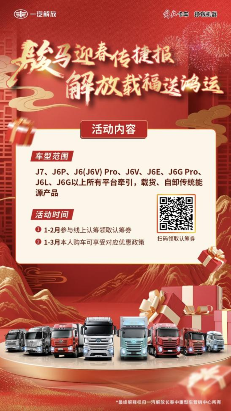 马年新春到来之际,一汽解放长春、青岛基地联动,覆盖解放传统和新能源车型,惠及购车、用车、换车全生命周期,多重豪礼诚意满满,为新年征程添福纳彩,助力用户喜迎马年“开门红”。
