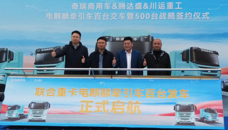 2026年3月12日,以“麒心协力 驭电共赢”为主题的奇瑞商用车&腾达盛&川运重工电麒麟牵引车百台交车暨500台战略签约仪式在四川德阳隆重举行。现场电麒麟牵引车整齐列阵,共启西南绿色物流迈向规模化运营的关键一步。