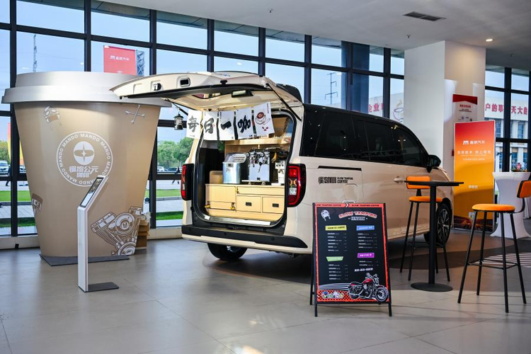 移动咖啡车的出现,颠覆了现场不少人的认知。后备箱开口处架着一台意式咖啡机,双侧侧滑门拉开后——一侧露出木质吧台。向上V6纯电模式下零排放静音运营,停在商圈、市集、公园一角即可开门迎客,一辆车就是一家店。