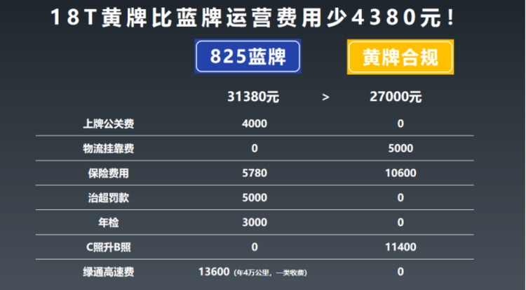 也许有人会说,驾驶证升级不得花钱吗?别急,我们先来算一笔账。一台车的运营成本包含从上牌到报废的所有费用,而不能只算购车和驾驶证升级所花费的钱。根据下图得出,黄牌合规车不但没有比超规蓝牌轻卡贵,反而整体运营成本还要低出一些。