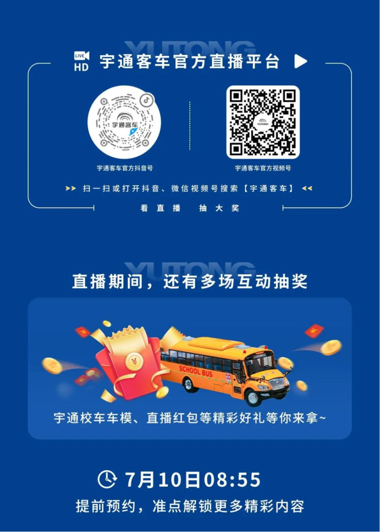 7月10日上午08:55-11:15,宇通校车将通过宇通客车抖音号、宇通客车视频号进行现场直播。不想错过本次活动的精彩内容,那就不妨早早参与进来,前往预约直播吧,更有宇通校车车模、直播红包等精彩好礼等你来拿!