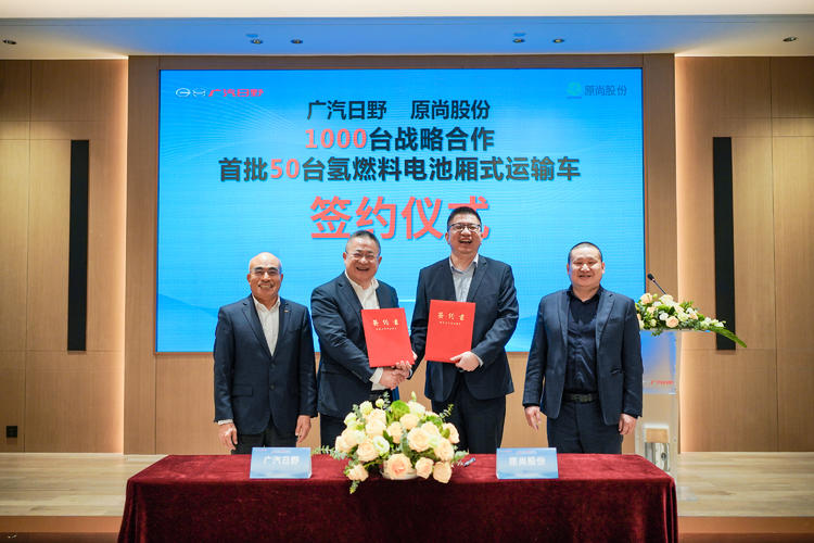 2023年12月6日,广汽日野汽车有限公司与广东原尚物流股份有限公司正式签署1000台氢能物流用车战略合作协议,2024年1月3日,广汽日野与原尚股份首批50台氢燃料电池厢式运输车订单签约仪式在广州从化成功举办。广汽集团执委、广汽日野董事长陈秀深,广汽日野执行副总经理张志勇,广汽日野党委书记、工会主席夏强,原尚股份董事长余军、总经理曾海屏,以及原锋新能源总经理陈海华等代表出席仪式。