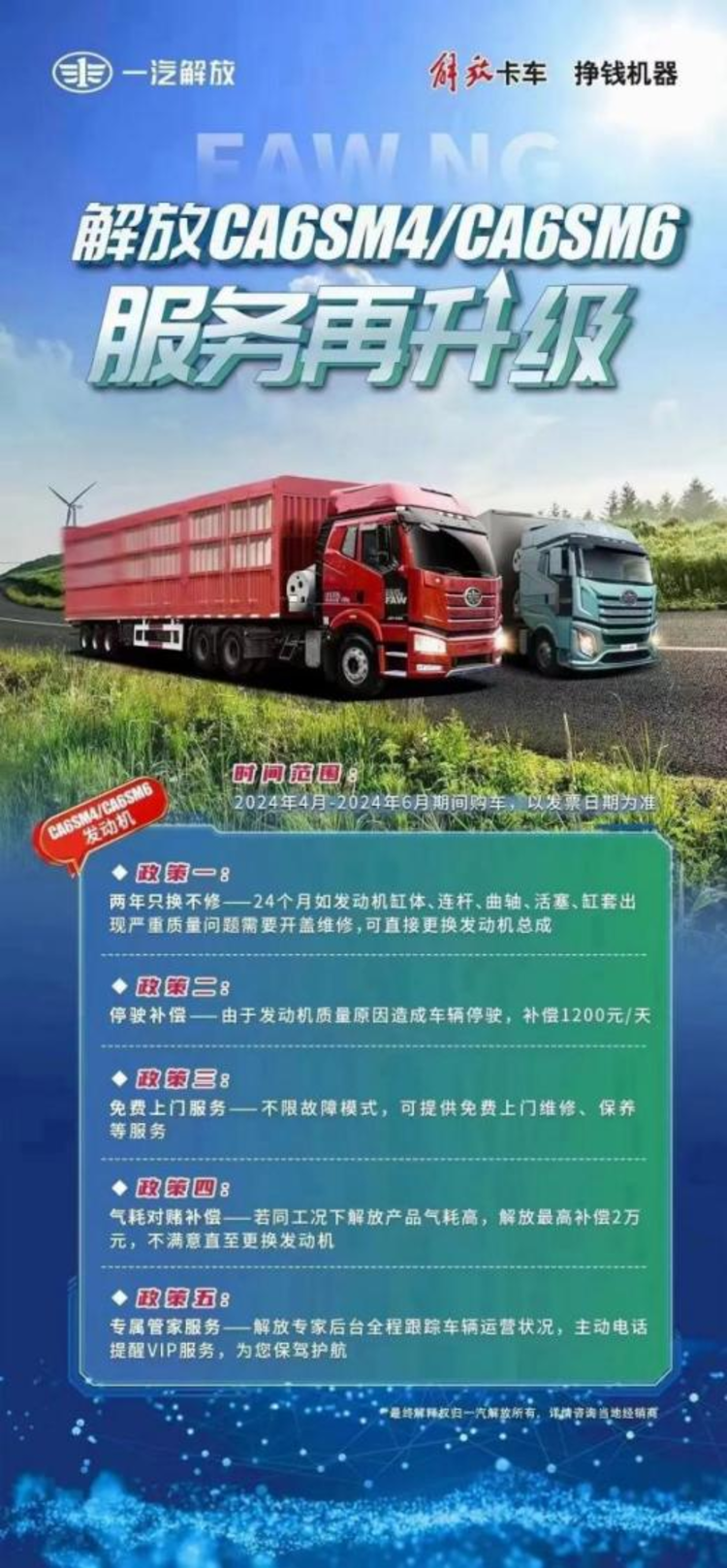 一汽解放紧跟市场趋势,凭借优异的产品、良好的市场口碑和强力的服务保障,一季度NG车市场份额达33.7%,展现出强劲的增长势头。与此同时,一汽解放服务再升级,强势推出了一系列专属服务政策,在行业内引起了广泛关注。两年只换不修、停驶补偿、气耗对赌补偿、免费上门服务、专属管家服务......这一系列政策不仅体现了解放对于自身产品的高度自信,更是对用户需求的深度理解和满足。那么,一汽解放究竟有何底气敢于做出如此承诺呢?
