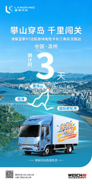 攀山穿岛,千里闯关!距潍柴蓝擎X7远航版纯电轻卡长三角实况挑战还有3天